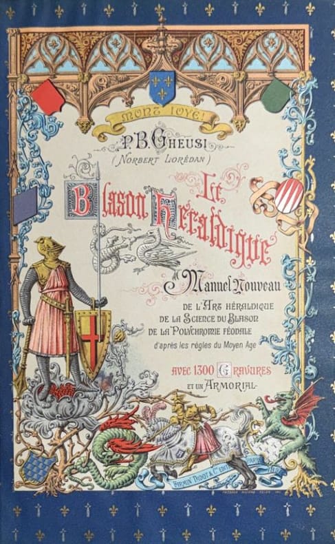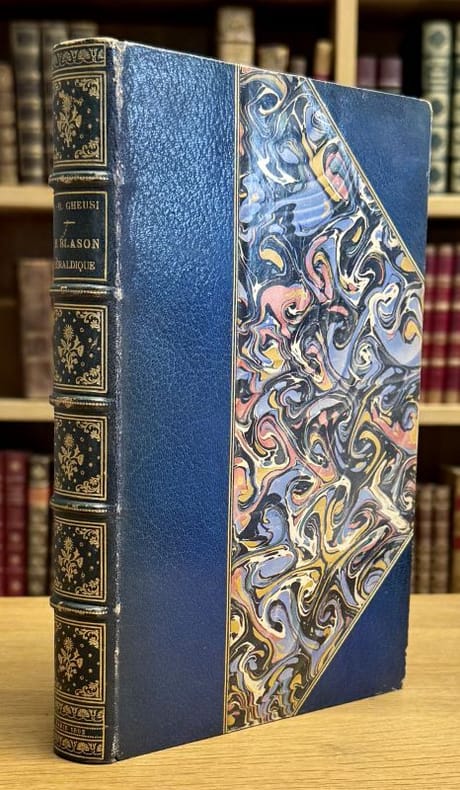 Paris Firmin-Didot 1892 1 vol. relié grand in-8, relié demi-maroquin bleu à coins bordés d'un double-filet doré, dos à nerfs orné de fleurons et décors dorés, couvertures conservées (Ritter), XXVII + 373 pp., 1300 blasons dans le texte, index. Edition originale de ce "manuel nouveau de l'art héraldique, de la science du blason et de la polychromie féodale d'après les règles du Moyen Age". Bonne reliure signée de l'époque, avec ses belles couvertures polychromes conservées.