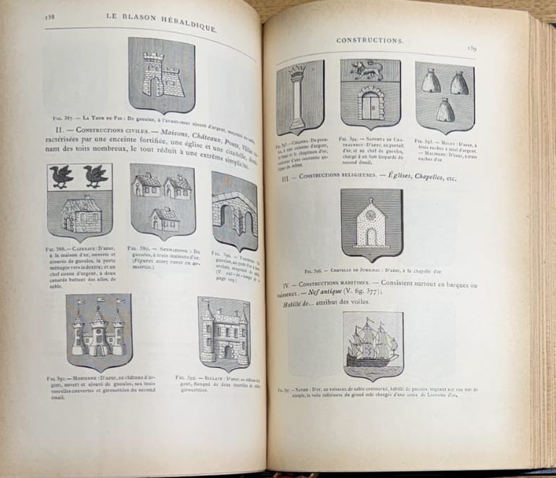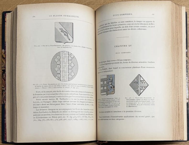 Firmin Didot 16,5 x 25 Couverture rigide Paris 1892 Volume grand in-8, demi-basane havane du début XXe, titres et filets dorés au dos, plats recouverts d'un papier à la cuve aux motifs "peigne" sur fond rouge, XXVII-373 pp. Ouvrage de référence articulé autour de l'Ecu d'armes (en général, des figures héraldiques, des figures naturelles et artificielles) et Ornements extérieurs à l'écu (applications), accompagnés de 1300 gravures et un armorial. In fine index héraldique, des noms propres. Petit manque de papier sur le plat supérieur, bonne reliure, coins parfaits, feuillets 3 à 14 légèrement déreliés. Très bon exemplaire.