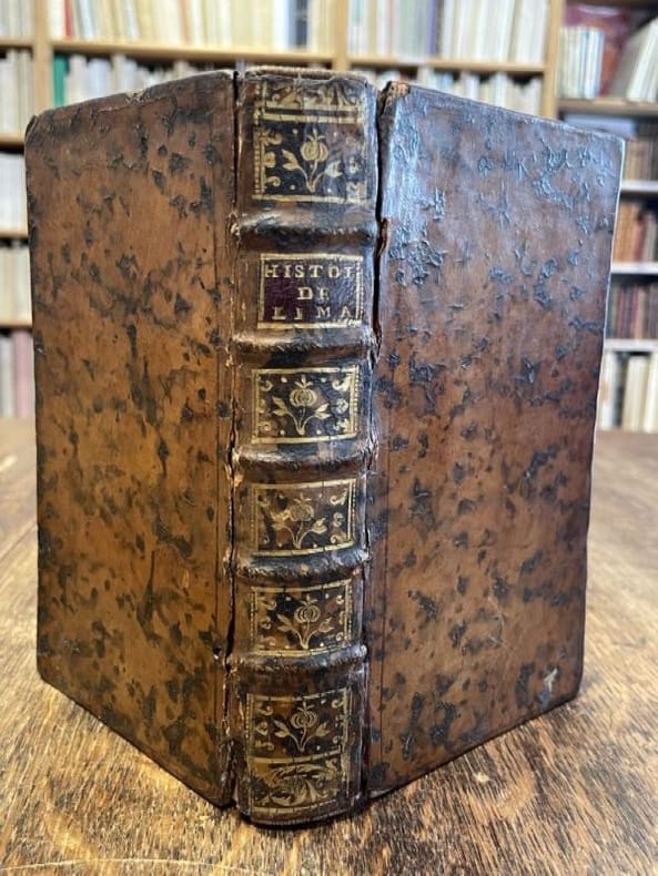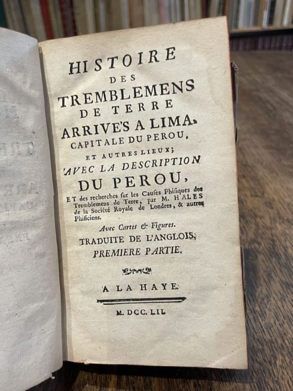 La Haye sans nom 1752 1 vol. relié 2 parties en 1 vol. in-12, relié plein veau marbré havane, dos à nerfs orné de filets et fleurons dorés, tranches rouges (reliure de l'époque), XVI + 221 + (9) pp. et p. [223]-445., 7 planches gravées dépliantes (mors fendillés, petites déchirures sans manque et pâle mouillure marginale aux planches). Edition originale française (traduite sur l'édition anglaise de Henry Johnson) de cette relation des ravages causés par le tremblement de terre de Lima le 28 octobre 1746 attribuée au missionnaire Pedro Lozano (1697-1752), complétée d'études sur les causes de ces phénomènes (par Stephen Hales) et d'une description détaillée du Pérou et de ses habitants. L'ouvrage est bien illustré d'une carte et de 3 plans dépliants, et de 3 planches dépliantes montrant des scènes de la vie quotidienne. Peu courant.