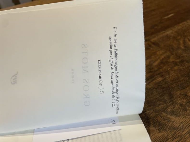 Paris Gallimard 1999 1 vol. Broché in-8, broché, couverture à rabats, non coupé, 310 pp. Edition originale. Un des 20 exemplaires numérotés sur vélin pur fil chiffon de Lana, seul grand papier. Ex-libris gravé Vincent Morel. En très bonne condition.