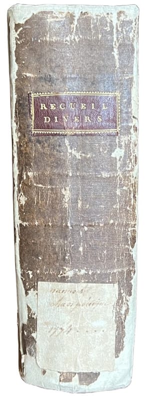 , , [1774 ca]. Environ 300 pièces manuscrites reliées en 1 fort volume in-4, cartonnage brun, pièce de titre en maroquin rouge recueil divers, étiquette manuscrite à l'encre du temps sur le dos Chaos poétique 1774 (reliure de l'époque).