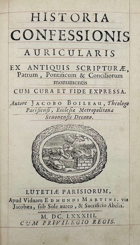 Édition originale. Histoire et plaidoyer latins pour la confession auriculaire par Jacques Boileau (1635-1716) frère de Nicolas, par ailleurs doyen et grand-vicaire de Sens dont Voltaire disait qu'il est « un esprit bizarre qui fait des livres bizarres ». Son ouvrage le plus fameux reste l'Abus des nudités de gorge (1674), mais il est aussi l'auteur d'une Histoire des flagellants (1701) et d'un Traité des empêchements dirimants du mariage (1691), trois titres répertoriés dans la Bibliographie clérico-galante (p.25) - qui ne mentionne pas la présente Historia confessionis auricularis. Provenance : bibliothèque de Joseph Xaupi (1688-1778) avec son ex-libris armorié, chanoine de l'Église de Perpignan et doyen de la Faculté de théologie de Paris, auteur d'une Oraison funèbre de Louis XIV (1746), de Recherches historiques sur la noblesse des citoyens honorés de Perpignan et de Barcelone, (1763) etc. Très bel exemplaire réglé, dans une reliure du temps en maroquin noir à la Du Seuil.