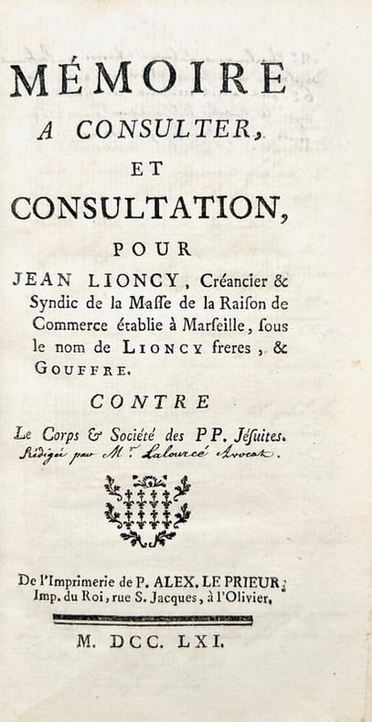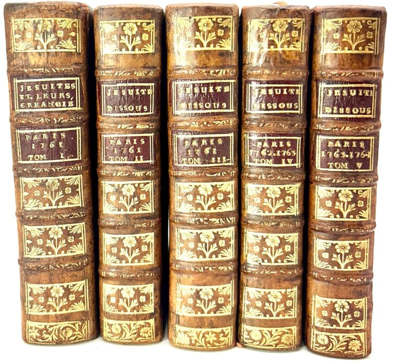 Importante collection sur le processus d'anéantissement de la puissante et redoutée Société de Jésus, qui débuta par une banale affaire de droit commercial, le scandale financier du RP. Lavalette (1761). Le parlement de Paris se chargea rapidement d'en faire une immense affaire politico-religieuse et en fit le procès global de la Compagnie de Jésus, de sa présence et de ses activités en France. On y trouve entre autre les écrits en 1761 des deux opposants les plus acharnés des jésuites qui mirent le feu aux poudres : l'abbé Chauvelin et l'avocat général Omer Joly de Fleury.Cet collection à été réunie à l'époque par un farouche opposant aux Jésuites qui à placé en tête des volumes une table avec une pagination manuscrite très détaillée, et des notes personnelles en marge et en bas de page.Tome I. Paris. 1761. Affaires des Jésuites avec les Lioncy, frères & Gouffre ; 5 pièces reliées en 1 vol. [LALOURCÉ (Jean Charlemagne)]. Mémoire a consulter, et consultation pour Jean Lioncy, créancier & syndic de la masse de la raison de commerce, établie à Marseille, sous le nom de Lioncy frères & Gouffre, contre le corps & Société des PP. Jésuites. Paris, De l'imprimerie de P. Alex. Le Prieur, 1761. In-12 de (4)-531-(1) pp. Signé, Me Laourcé, Avocat. Lambert, Proc. Barbier III, 123 ; Sommervogel XI-1775 (12).Mémoire à consulter et consultation pour les Jésuites de France. A Paris, De l'Imprimerie de L. Cellot,1761. In-12 de (2)-60 pp. Délibéré à Paris le dix Mars mil sept cens soixante -un. Signé, Lherminier , Gillet, Mallard, Taboué, De La Monnoie, Babille, Thevenot, D'essaule. Au sujet d'une sentence, du 30 janvier 1760, qui les condamne solidairement au paiement des lettres de change tirées sur les sieurs Lioncy et Gouffre par le P. La Valette (10 mars 1761). [LE PELLETIER DE SAINT FARGEAU (Etienne-Marcel) & LAGET BARDELIN (Marc-Antoine)]. Mémoire pour les Jésuites des provinces de Champagne, Guyenne, Toulouse et Lyon, opposans et défendeurs, contre le syndic des créanciers Lioncy et Gouffre défenseur à l'opposition & demandeur. Et encore contre les sieurs Lioncy et Gouffre, intervenans et demandeurs, en présence des Jésuites de la province de France. A Paris, chez J. Chardon, 1761. In-12 de 50 pp. Signé : Monsieur De Saint-Fargeau, Avocat Général. Me Laget-Bardelin, Avocat. Chalumeau, Proc.Mémoire sur les demandes formées contre le général de la société des Jésuites, au sujet des engagemens qu'elle a contractés par le Ministère du Père de La Valette. Paris, 1761. In-12 de 96 pp. Le titre de départ, p. 3. porte : Mémoire pour le sieur Cazotte, Commissaire Général de la Marine, et pour la Demoiselle Fouque, contre le Général de la société des Jésuites et in-fine Cette édition est faite sur l'édition in-4°, signée de MM. Rouhette & Target fils, avocat au parlement.Arret de la cour du parlement. Sans lieu, (1761). In-12 de 8 pp. Le titre de départ p. 3. porte : Arrêt de la cour du parlement, qui condamne le Supérieur Général, &, en sa personne, le Corps et Société des Jésuites, à acquitter la somme de 1 502266 l. 2 sols 2 den., de Lettres de change tirées par le Frere de La Valette, sur les Lioncy freres, & Gouffre, Négociants à Marseille, en 50 000 liv. de dommages & intérêts, & à tous les frais dépens : Fait dépenses au Freres de la Valette Jésuites, & à tous autres, sous telles peines qu'il appartiendra, de s'immiscer directement ni indirectement dans aucun genre de trafic, &c. Du 8 mai 1761. Signé : Dufranc.Tome II. Paris. 1761.COUDRETTE (Abbé Christophe). Idée générale des vices principaux de l'institut des Jésuites, tirée de leurs constitutions & des autres titres de leur Societe. Et leur état en France. Sans lieu ni date (1761). In-12 de (2)-68 pp. Détaille point par point les griefs qui pèsent sur la Société. Virulent pamphlet de L'abbé Christophe Coudrette (1701-1774) l'un des meneurs du parti janséniste et des plus farouches opposants aux jésuites est l'auteur de plusieurs pamphlets contre la Compagnie de Jésus. Ce brûlot anti-jésuite fut aussitôt l'objet d'une riposte écrite restée anonyme. Sommervogel, XI, 1272.[CHAUVELIN (Henri-Philippe de)]. Discours d'un des Messieurs des Enquêtes au Parlement, toutes les chambres assemblées, sur les Constitutions des Jésuites. Du dix-sept avril mil sept cents soixante-un. Sans lieu ni date (1761). In-12 de 46 pp. Henri Philippe de Chauvelin (1714-1770) chanoine de Notre-Dame de Paris et conseiller au Parlement de Paris, proche des jansénistes, fut l'un de ceux qui osa s'attaquer aux Jésuites, et fut enfermé par lettre de cachet au Mont Saint-Michel. Dès qu'il fut libéré il reprit son combat jusqu'au banissement de la Compagnie. Ce libelle fut sa première attaque. Le compte rendu du procureur général Omer Joly de Fleury ne vint qu'après et Chauvelin eut l'honneur de cette initiative dans cette terrible affaire.JOLY DE FLEURY (Omer). Compte rendu des Constitutions des Jésuites par MM. les Gens du Roi, M. Omer Joly de Fleury, Avocat dudit Seigneur Roi, portant la parole, les 3, 4, 6 & 7 juillet 1761, en exécution de l'Arrêt de la Cour du dix-sept avril précédent, & de son Arrêté du deux juin audit an. Sans lieu, (1761). In-12 de 310 pp. Omer Joly de Fleury présenta et commenta en plusieurs séances les Constitutions, et démontra que, d'après ces textes, le Général de l'Ordre était au-dessus des conciles, des papes, des évêques, des rois et de la justice ; nul Jésuite ne pouvait, en matière civile ou criminelle, répondre aux magistrats sans l'autorisation de ce chef ; et la puissance du personnage était d'autant plus redoutable que des hommes de toutes conditions, ecclésiastiques ou laïques, célibataires ou gens mariés, pouvaient s'affilier à l'Ordre et lui apporter le secours de leurs relations dans le monde. Omer Joly de Fleury insista sur le vœu d'obéissance des Jésuites. Sur les conclusi