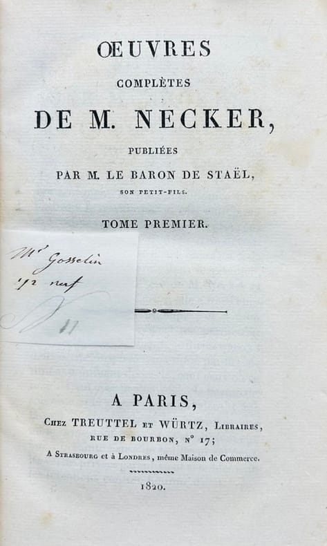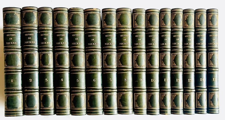 Première édition collective complète des oeuvres de Necker. 1. Notice sur M. Necker, pas A. L. de Staël-Holstein. Sur la législation et le commerce des grains. Portrait 2 cartes dépliantes. 2. Compte rendu au roi. Mémoire publie par M. Necker au mois d'avril 1787. Nouveaux éclairissements sur le Compte rendu au roi. 3. Premier ministère de M. Necker. 4 - 5. De l'administration des finances de la France. 1 tableau dépliant. 6. Sur l'administration de M. Necker. Second ministère de M. Necker. 7. Troisième ministère de M. Necker. Table chronologique des actes du second et du troisième ministère de M. Necker. 1 table dépliant. 8. Du Pouvoir exécutif dans les grands Etats. 9 - 10 De la Révolution francoise. Réflexions phliosophiques sur l'égalite. 11. Dernières vues de politique et de finance. Réflexions présentées à la Nation francoise, sur le procès de Louis XVI. Table chronologique des actes du premier ministère de M. Necker. 12. De l'importance des opinions religieuses. 13 - 14. Cours de morale religieuse. 15. Mélanges: Eloge de J. B. Colbert. Réponse au Mémoire de M. l'Abbé Morellet, sur la Compagnie des Indes. Manuscrits de M. Necker. Pensées détachées. Esquisses de pensées. Suites funestes d'une seule faute. Nouvelle. Bel exemplaire.