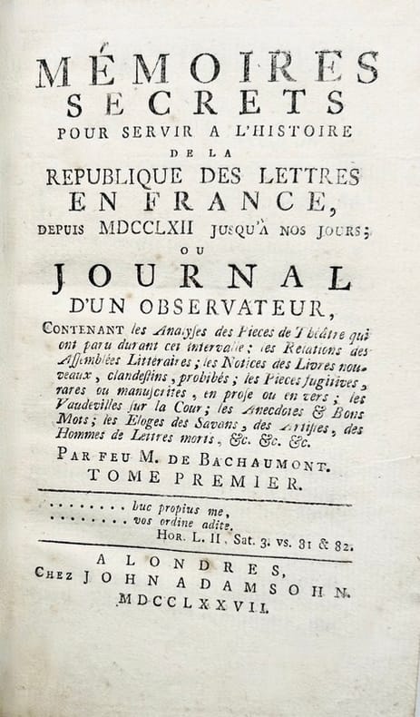 Source de tout premier ordre pour l'histoire de la seconde moitié du dix-huitième siècle.Bachaumont vivait chez une dame Doublet qui tenait un salon célèbre où les plus illustres personnages de l'époque se côtoyaient. On y élabora tous les jours, de 1762 à 1769, un journal on l'on insérait à leur date les nouvelles courantes après les avoir discutées et examinées soigneusement. Après le décès de Bachaumont, en 1771, le journal fut racheté et continué jusqu'au 31 décembre 1787, par diverses personnes, entre autres l'avocat Mouffle d'Angerville, et Pidansat de Mairobert, familier de la maison Doublet, secrétaire des commandements du duc de Chartres. Ce fut seulement en 1777 à Londres que l'ouvrage commença à être publié ; les neuf premiers volumes parurent dans le cours de l'année, puis ensuite au rythme d'un par an. Il y eut plusieurs tirages. On joint le volume de table publié en 1866 et indispensable à l'utilisation des Mémoires secrets. Bel exemplaire en reliure d'époque. Hatin, 66-67 ; Sgard, 904.