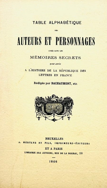 Londres, John Adamson, 1784-1789. 36 vol. in-12, demi-basane, dos lisse orné de filets dorés, le tome 34 est relié dans une reliure différente, la table est brochée (reliure de l'époque). Joint : Table alphabétique des auteurs et personnages cités dans les mémoires secrets. Bruxelles, 1866.