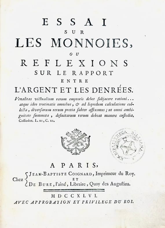 Édition originale. Dupré de Saint-Maur est le premier à montrer les rapports des monnaies et du prix des denrées, qu'il illustre par un tableau des variations des prix de certains produits tels les grains, le vin, l'huile, etc., depuis 1002 jusqu'en 1742.Provenance : Cachet ex-libris sur la page de titre Ex Bibliotheca Billiana, du nom de Nicolas Antoine Labbey de Billy descendant d’une famille comtoise ancienne de Haute-Saône. Il fut reçu avocat et reprit des études de théologie au séminaire de Saint-Sulpice à Paris; il fut ordonné à Besançon en 1782, nommé chanoine métropolitian, puis vicaire de l’évêque de Langres, Guillaume de la Luzerne. Prêtre réfractaire lors de la Révolution, il émigra en 1793, se rendit en Suisse, en Allemagne, puis en Italie. Lorsqu’il rentra en France au début du XIXe siècle, il rapporta une collection de manuscrits et de livres anciens. De 1809 à 1817, il fut professeur d’histoire à l’université de Besançon et publia en 1814 la première Histoire de l’université du comté de Bourgogne, en 1817 un recueil de Sermons. Les livres de sa bibliothèque portent comme ex-libris un cachet à ses armes avec la devise de sa famille «Sine labe», entourées de l’inscription «Ex bibliotheca Billiana».Bel exemplaire. Réparation au bas de la page de titre. INED, 1643 ; Einaudi, 1687 ; Stourm, p. 42.