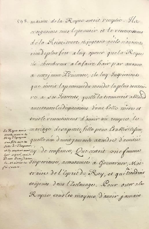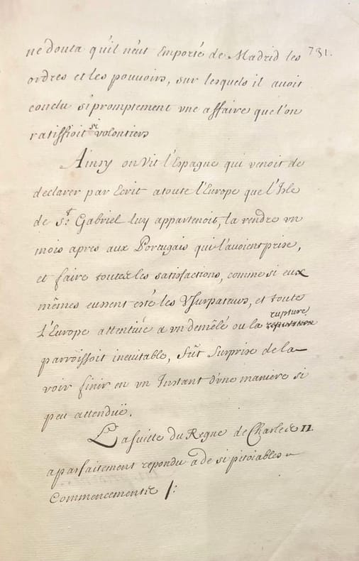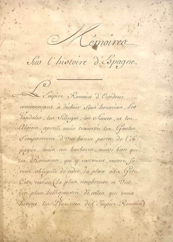 Important recueil établi dans la première moitié du XVIIIe siècle, anonyme et manuscrit qui compile et met en forme plusieurs sources identifiables pour servir à l'histoire de l'Espagne. Incipit : L'Empire Romain d'Occident commençant à déchoir sous Honorius, les Vandales, les Filinges, les Suèves et les Alains, après avoir traversé les Gaules, s'emparèrent d'une bonne partie de l'Espagne… (Explicit :) La suite du règne de Charles II a parfaitement répondu à de si pitoiables commencements. Contient : L'Empire Romain (p. 1) Charles Quint (96) Instructions de Charles V à Philippe second son fils (187) De la découverte de l'Amérique (239) Philippe Second (333) Demelez entre les François et les Espagnols touchant les presseance (393) Portrait de Philippe Second (433) Instructions secrètes laissées au Roy Philippe III d'Espagne par Philippe II son pere (453) Philippe III (475) Philippe IV (511) Charles II (576).Parmi les dix chapitres (de graphie à chaque fois différente) qui composent cette histoire, nous avons pu authentifier trois sources (non attribuées dans le texte) à savoir 1. l'Histoire du Monde d'Urbain Chevreau (troisième édition de 1717) pour le chapitre sur la Découverte de l'Amérique (p. 244, Les Insulaires accourus en foule à l'arrivée des Espagnols…) 2. Les Instructions secrètes laissées au Roy Philippe III (p. 453) furent publiées par Sully (Mémoires) sous le titre Testament du Roy d'Espagne 3. le dernier chapitre sur le règne de Charles II (p. 576) est un extrait des Mémoires de la cour d'Espagne, de 1679 à 1681 du Marquis de Villars publiés une première fois en 1733 (Lorsque Dom Juan entra dans le gouvernement…). En 1860, Jacques Mangeart décrit sous le titre Mémoire sur l'Espagne et sur le Portugal (n°587 du Catalogue descriptif et raisonné des manuscrits de la bibliothèque de Valenciennes) 2 volumes petit in-folio manuscrits et anonymes qui présentent le même incipit : L'Empire Romain d'Occident commençant à déchoir sous Honorius (…).Un feuillet (pp. 25-26) restauré en marge, les premiers feuillets légèrement roussis ; reliure restaurée.Rare recueil manuscrit établi au XVIIIe siècle qui rassemble sous le voile de l'anonyme les sources importantes publiées à l'époque sur le Royaume d'Espagne.
