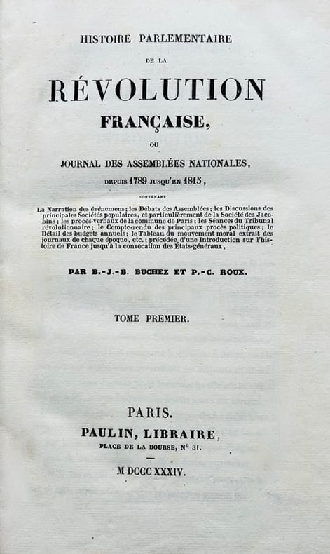 « Oeuvre gigantesque, sans plan, sans style, qui contient un amas de documents, la réimpression d'une partie du Moniteur, des articles de journaux, des pamphlets et jusqu'à des mémoires dans leur texte intégral » (A. Aulard, cité par P. Caron, Manuel pratique, p 253). Bel exemplaire.