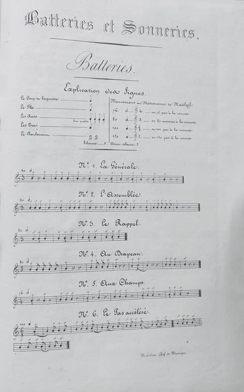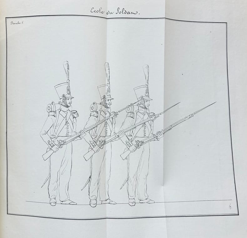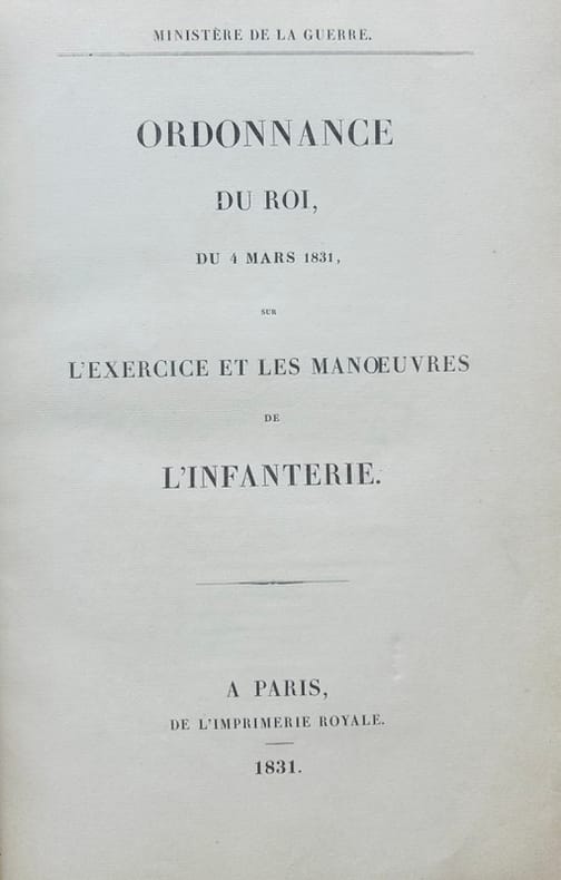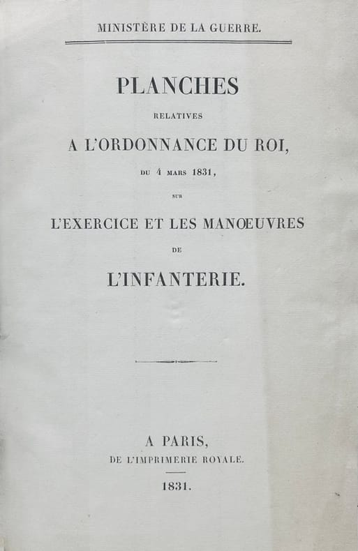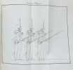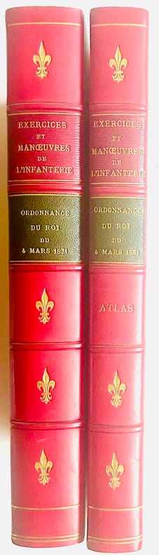 Édition originale. Nouveau règlement de l'infanterie française au début du règne de Louis-Philippe bien complet de son atlas contenant 64 planches dépliantes, dessinées et lithographiées par C. Frenet, chef de bataillon au corps royal d'état-major pour l'école du soldat, déplacement des bataillons, peloton de tirailleurs, placement sur les champs de bataille, etc. In fine 9 planches de musique gravées, Batteries & sonneries, composées par Pierre Melchior, chef de musique, qui sont encore en usage de nos jours pour l'infanterie. Très bel exemplaire à grandes marges.