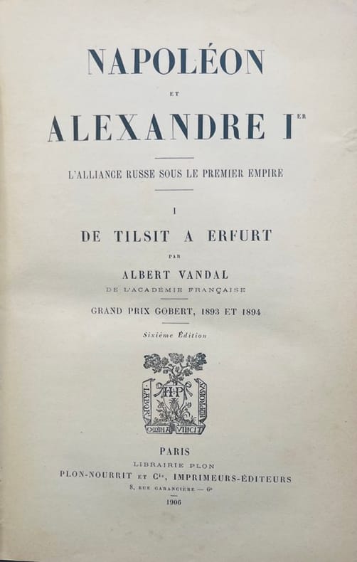 Tilsit à Erfurt - 2: 1809 - Le second mariage de Napoléon - Déclin de l'alliance,Paris, Plon, Nourrit et Cie 1897- 1898, XXXIII-527 pp., 2 vol. in 8 br. défr., cach., découpe aux pages de titre sans atteinte du texte. Manque le tome III et dernier : La rupture - Les portraits annoncés pour le tome I ne sont pas présents. La meilleure étude sur les relations entre Napoléon Ier et la Russie - Grand prix Gobert.