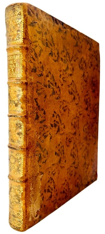 À Paris, De l'Imprimerie Royale, 1788 in-8, [4]-267 pp., 6 pl. dépliantes (dont 2 plans de la salle d'assemblée des Notables), demi-basane fauve, dos lisse orné, filets dorés, tranches mouchetées de rouge (rel. de l'époque). Petite galerie de ver dans les mors, mors inf. un peu fendu, petites usures aux coins et sur les coupes. Traces d'humidité sur plusieurs feuillets. Une garde fragile, un trou discret dans la page de faux-titre. Ressaut des deux premiers cahiers.