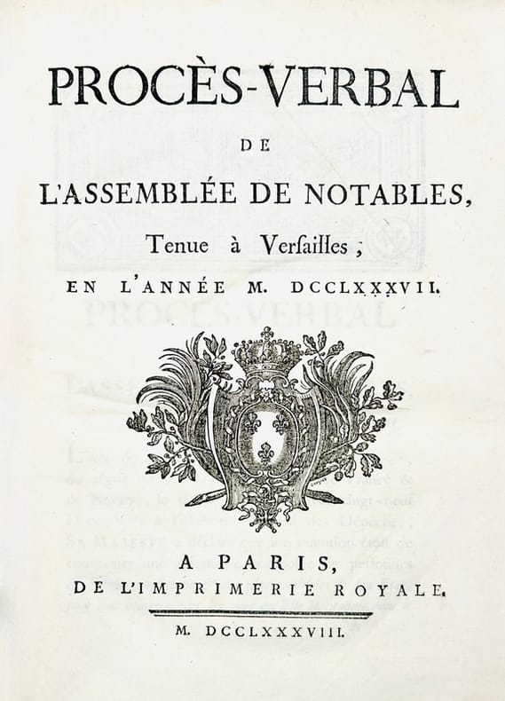 Paris De l'Imprimerie Royale 1788 in 8 (20,5x13,5) 1 volume reliure demi velin moderne, dos lisse, pièce de titre de cuir noir, 267 pages, avec 6 planches dépliantes, dont 2 plans de la salle d'assemblée des Notables. Ex-libris R. V. F. Bel exemplaire ( Photographies sur demande / We can send pictures of this book on simple request )