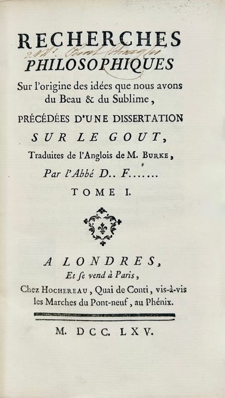 Exemplaire de dédicace aux armes du marquis d'Hertford ambassadeur d’Angleterre en France, serties de la devise de l'Ordre de la Jarretière Honi soit qui mal y pense.Première édition française de l'essai d'Edmund Burke, établie huit ans après l'originale publiée à Londres en 1757. Ces réflexions esthétiques du philosophe anglais (1729-1797) inspirèrent Diderot le premier qui dans son Salon de 1767, écrivit : « Tout ce qui étonne l'âme, tout ce qui imprime un sentiment de terreur conduit au sublime ».Son traducteur l'Abbé Des François qui signe la préface, dédicaça son travail A son Excellence Milord Francis Seymour Conway, Comte d'Ertford, Vicomte de Beauchamp, Baron de Conway et de Kilultah, Chevalier de l'Ordre de la Jarretière, Ministre du Conseil privé du Roi, & Gentilhomme de la Chambre, Lord-Lieutenant, et Garde des Archives du Comté de Warwick, Ambassadeur extraordinaire & Ministre plénipotentiaire de Sa Majesté Britannique près Sa Majesté Très-Chrétienne.Francis Seymour baron Conway (1718-1794) comte puis marquis d'Hertford ambassadeur d’Angleterre en France de 1763 à 1765 puis lord lieutenant d'Irlande, enfin lord Chambellan de 1766 à 1782 ; Horace Walpole salua ses qualités de "decorum and piety".Très bel exemplaire.Les armes du marquis poussées pour l'occasion furent d'ailleurs reprises approximativement par le doreur français qui en lieu et place de la paire d'ailes de la Maison Seymour y substitua deux croix. Ex-libris manuscrit à l'encre du temps sur le titre "Paul Colnagh".