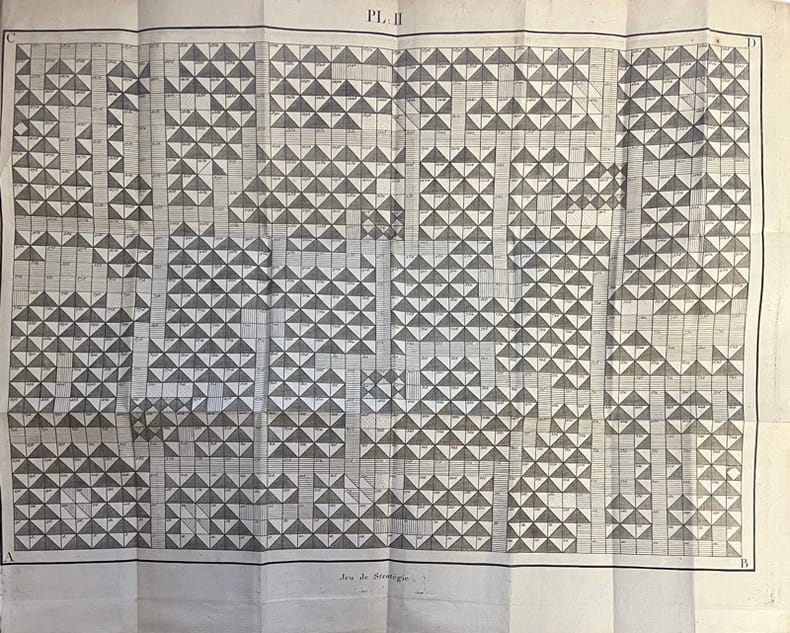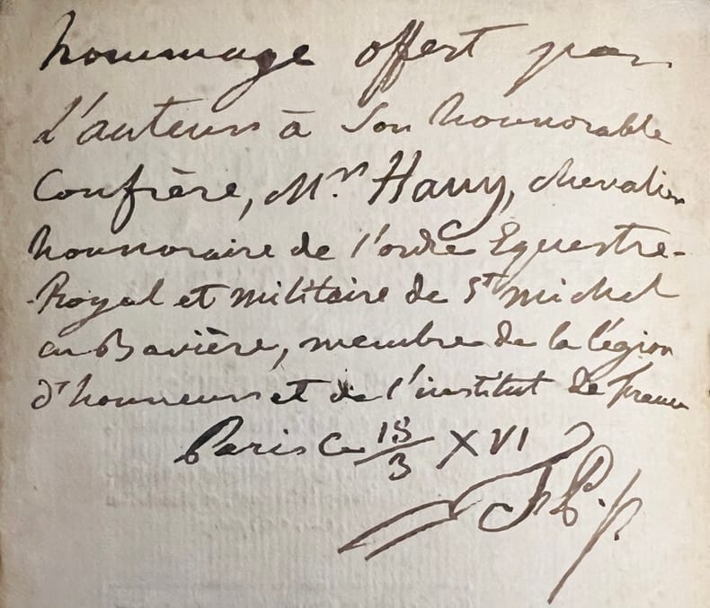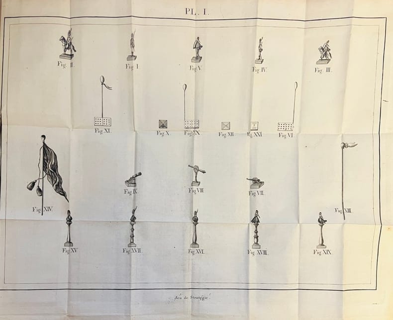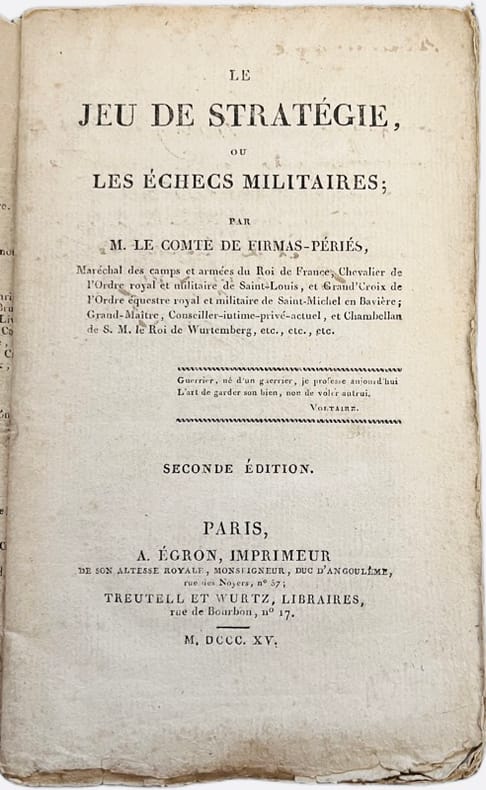 Deuxième édition rare, la première publiée à Paris sous la Restauration au moment où le comte de Firmas-Périés était nommé Maréchal de camp par Louis XVIII. L'édition originale avait paru sept ans plus tôt à Memmingen en Bavière tandis que le même occupait le poste de chambellan et conseiller intime de Frédéric, roi de Wurtemberg. Ce jeu d'échecs a pour objet d'imiter tout ce qui dans l'art de la guerre tient au mécanisme des combinaisons, aux manoeuvres et au mouvement des troupes, à l'effet des armes à feu, au choc des masses, aux moyens physiques et artificiels de défense, au calcul des subsistances et généralement à tout ce qui donne lieu aux combinaisons militaires.2 grandes planches repliées dont la représentation de l'échiquier et ses 19 pièces. Armand-Charles-Daniel, comte de Firmas-Périés (1770-1828) commença sa carrière militaire en 1785 en qualité de sous-lieutenant dans le régiment de Piémont. Il se rendit à Worms en 1791 auprès du prince de Condé et s'engagea dans l'Armée des émigrés où il se distingua plusieurs fois à la tête du régiment de Hohenlohe-Schillingsfürst dont il était colonel. En 1815, Louis XVIII lui confia quelques mission diplomatiques avant d'être admis à la retraite en 1819. Il se retira en Allemagne où il mourut en 1828. Il a laissé des ouvrages politiques mais aussi une Pasitélégraphie en collaboration avec Joseph de Maimieux, l'inventeur de la Pasigraphie.Exemplaire du grand minéralogiste René-Just Haüy (1743-1822) fondateur de la cristallographie géométrique et frère de Valentin Haüy qui consacra sa vie aux aveugles, qui porte la dédicace autographe de l'auteur : Hommage offert par l'auteur à son honorable confrère, Mr. Hauy, chevalier honoraire de l'ordre Equestre Royal et militaire de St Michel en Bavière, membre de la légion d'honneur et de l'Institut de France. Paris le 18/3 XVI. F.P. Gay, Bibliographie anecdotique du jeu des échecs, 109.
