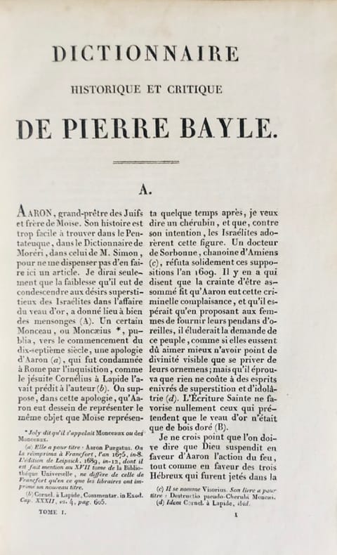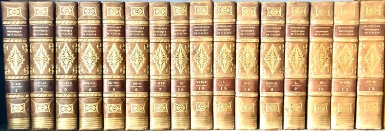 Nouvelle édition augmentée des notes extraites de Chaufepié, Joly, La Monnoye, Leclerc, Le Duchat, P. Marchand, etc., par les soins de Beuchot. Dans son discours préliminaire, l'éditeur fait l'histoire des dix éditions du Dictionnaire de Bayle qui ont précédées la sienne, et rend compte de son propre travail sur celle-ci.Bel exemplaire relié à l'époque.