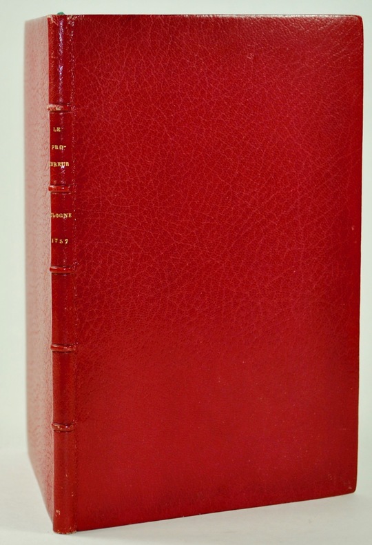 Cologne, , 1757. In-8 de (4)-77 pp., maroquin rouge, dos à nerfs, large dentelle dorée sur les chasses, double filet doré sur les coupes, guillochis dorés sur les coiffes, signet de soie verte, tranches dorées sur marbrure (Belz suc. Niedrée).
