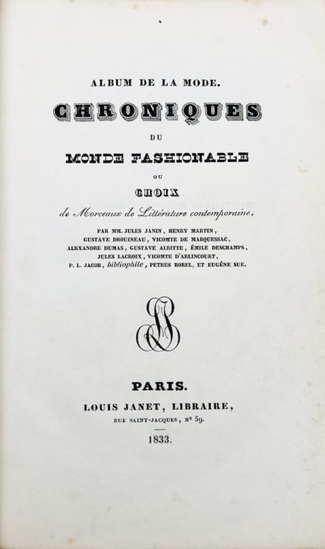 Par MM. Jules Janin, Henry Martin, Gustave Drouineau, vicomte de Marquessac, Alexandre Dumas, Gustave Albitte, Emile Deschamps, Jules Lacroix, vicomte d’Arlincourt, P.L. Jacob, Petrus Borel et Eugène Sue. Louis Janet libraire, Paris, 1833, 376 pages et 12 lithographies hors texte d’après Tony Johannot, Alfred Johannot, Devéria, A Mernut, etc. Dos cuir vert, mors supérieur fendu. Ouvrage rare.