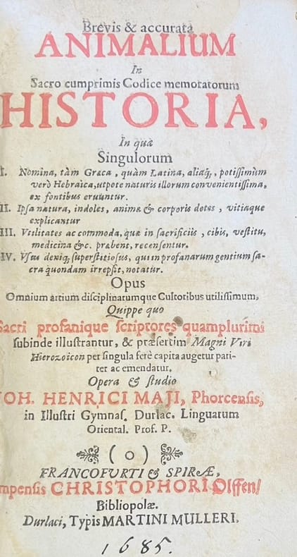 Édition originale ornée d'un frontispice à la licorne relié entre l'avis au lecteur et la dédicace. Histoire animale établie par le luthérien et professeur de théologie à Giessen Johannes Henricus Maius (1653-1719), sortie des presses de Christoph Olffen à Francfort.Titre rouge et noir, pièces liminaires, index. Historiae animalium Quapdrupedum (4 feuillets) qui doit être placé entre les pages 624 et 625, est relié in fine après la page 960. Feuillets roussis, mouillures.