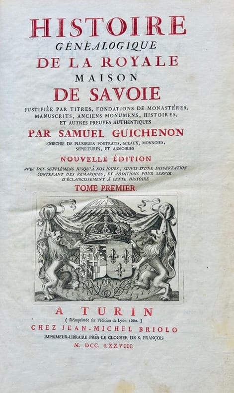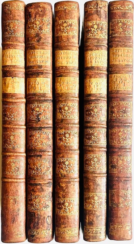 Nouvelle édition augmentée de suppléments.Portrait frontispice de Chrétienne de France, duchesse de Savoie, portrait de l'auteur ; nombreuses illustrations dans le texte : vignette de titre armoriée répétée, portraits en médaillon, vestiges et sculptures, blasons, etc. 3 planches dépliantes au tome II. Ex-ilibris manuscrit : Charles Scarzelli Avocat.Très bon exemplaire. Quelques épidermures à la reliure, des rousseurs et des feuillets brunis.Saffroy III, 50107 : « Édition plus belle que la précédente, aussi rare ».