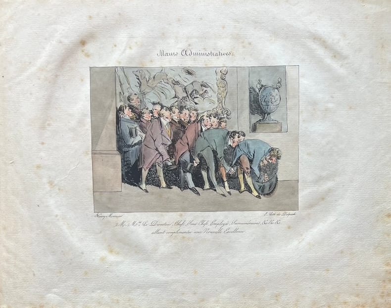 Suite complète de 12 lithographies coloriées en premier tirage, non numérotées - avec le titre illustré d'une vignette de Henry Monnier.Huit heures ; Neuf heures ; Dix heures ; Dix heures et demi ; Midi ; Une heure ; Deux heures ; Un Jour d'audience ; Demande d'augmentation ; M. le chef de division donnant une audience ; Quatre heures ; MM. les directeurs, chefs, sous-chefs.Cette satire de l'administration qui inspirera Balzac, est, selon l'ironique mention du titre, dessinée d'après nature : Monnier avait en effet débuté dans la vie comme employé au ministère de la Justice : « Bientôt las d'une existence casanière et d'une obéissance passive pour lui pesante, il démissionna. Il avait eu en tout cas assez de loisirs pour comprendre, étudier, noter les Moeurs administratives, depuis l'humble emploi de surnuméraire jusqu'au grade de chef de division » (Delteil, Manuel de l'Amateur d'estampes, II, 187).Bon exemplaire provenant de la bibliothèque Aristide Marie. Des rousseurs.Bibliothèque Aristide Marie (1928), n°610 ; Champfleury, Henry Monnier, sa vie, son oeuvre, p. 329 ; Beraldi, X, p. 97, n°385 à 396.