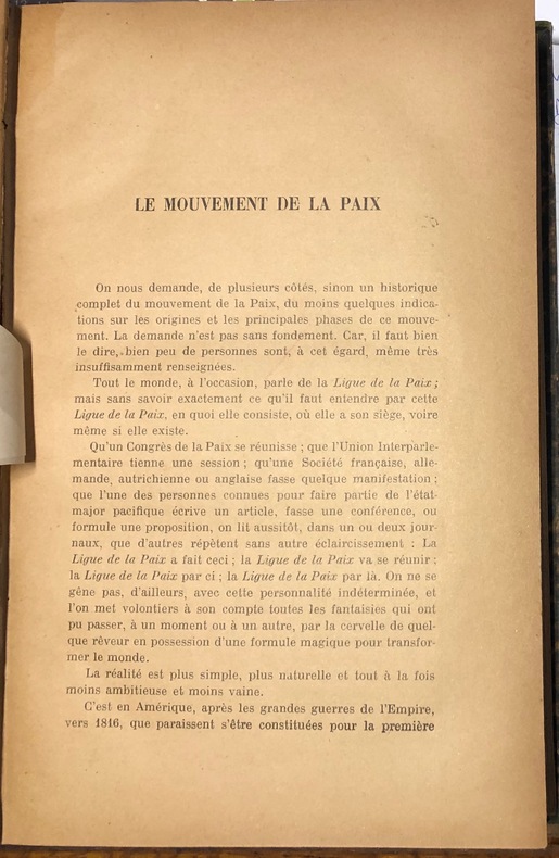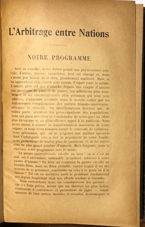 Collection complète de la deuxième série publiée de février à décembre 1901 inclus. Revue pacifiste fondée en 1898, abordant les questions internationales touchant les guerres africaine, chinoise, hispano-américaine, etc.« La guerre internationale est-elle un bien ? 0u si c'est un mal, est-il nécessaire, immuable, perpétuel, inhérent à notre nature d'homme ? Ou bien au contraire la guerre est-elle un terrible fléau, mais un fléau évitable, contre lequel il est des moyens de se prémunir, semblable en cela à la peste ou à la famine ? Tel est en quelques mots le problème fondamental que depuis longtemps déjà nos efforts tendent à résoudre. L'Utopie d'aujourd'hui est la vérité de demain ».Principaux collaborateurs : Frédéric Passy, R.-G. Lévy, L. Marillier, A. Weiss, Th. Barclay, P. Hunziker, G. Picot, J. Bardoux.H. La Fontaine, Bibliographie de la paix et de l'arbitrage international, 1904.