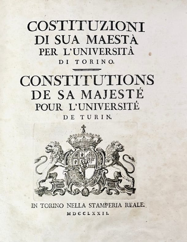 Édition originale bilingue, italien et français. « Les constitutions de l'université de Turin, qui furent édictées par Charles-Emmanuel III (1772), sont encore aujourd'hui un monument de haute sagesse, et l'on ne peut lire sans admiration les termes nobles et sévères qui fixent les attributions du magistrat de la réforme, à qui ces constitutions donnaient la haute direction de l'enseignement. Cette forte organisation de l'université de Turin paraît avoir produit un grand effet sur l'empereur Napoléon et n'avoir pas été sans influence sur le système qu'il inaugura en France. Nous trouvons cette impression indiquée par M. Rendu dans le passage suivant de son code universitaire : « Bonaparte passait à Turin. Un jour qu'il parcourait le palais de l'université fondée en 1720 par Victor-Amédée II, il se fit présenter les statuts qui régissaient cette institution. Il y vit quelque chose de grand et de fort qui le frappa. Cette grave autorité qui sous le nom de magistrat de la réforme gouvernait tout le corps enseignant, ce corps lui-même uni par des doctrines communes et librement soumis à des obligations purement civiles qui le consacraient à l'instruction de la jeunesse comme à l'un des principaux services de l'état, cet ordre de professeurs tous choisis parmi des agrégés nommés au concours, cette noble confiance de la puissance souveraine qui donnait au conseil chargé de la direction générale un droit permanent de législation intérieure et de continuel perfectionnement, tout ce plan d'éducation établi sur la base antique et impérissable de la foi chrétienne, tout cela lui plut, et il en garda le souvenir jusqu'au sein de ses triomphes ».» Ce remarquable passage, que nous avons voulu reproduire, offre un tableau saisissant de l'antique organisation scolaire du Piémont. » (Revue Des Deux Mondes-1863, p. 727). Ex-libris manuscrit sur la garde : Constitutions Royales pour l'Université de Turins (sic) appartenant à la Communauté de St. Paul. Baud secrétaire. Traces de mouillure sur les plats mais très bon exemplaire.