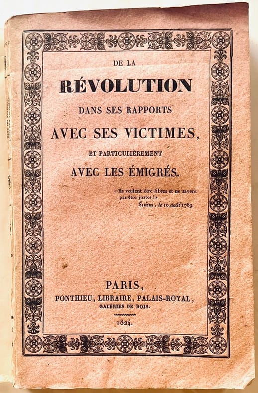 Édition originale. Curieux ouvrage publié avant la loi d'indemnité des émigrés, et pour la préparer. Madrolle (1791-1861), écrivain religieux et politique, journaliste, collabore au Conservateur et à La Gazette de France, se rangea, au retour des Bourbons, dans la frange la plus exaltée du mouvement légitimiste ; il excellait à injurier ses contemporains et tout particulièrement Chateaubriand. Marolle devint un fervent disciple d'Eugène Vintras, tomba dans un mysticisme de plus en plus exalté ; il qualifiait le choléra de divin et voulait absolument que nous soyons dans le dernier siècle de la période de 6 000 ans fixée pour la durée de notre planète. Il finit dans la démence la plus complète. Bel exemplaire broché.