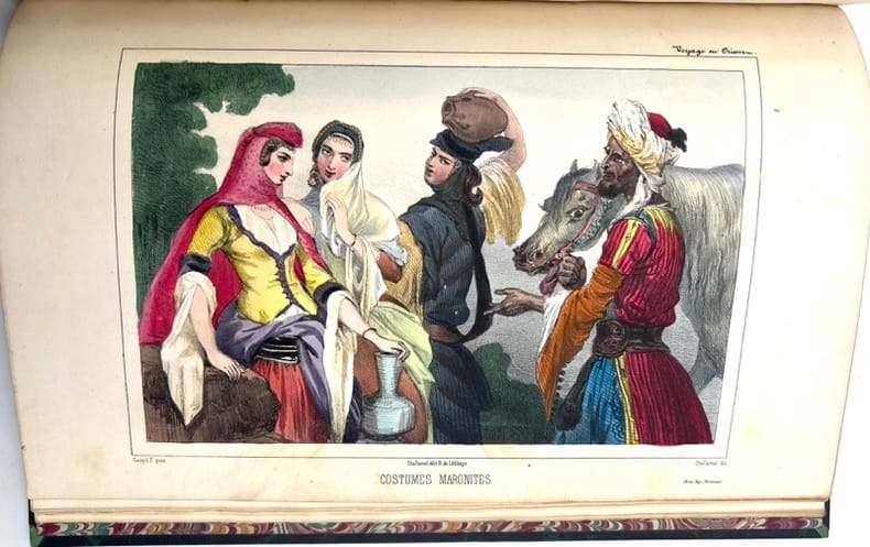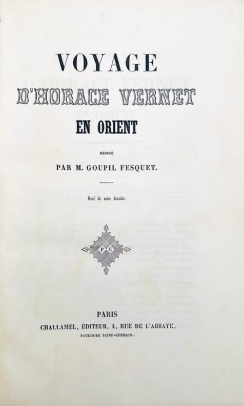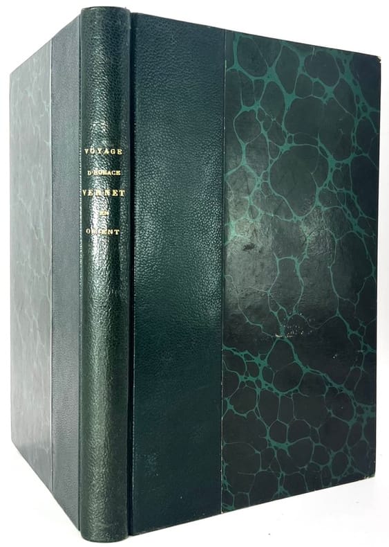 Premier tirage de cet ouvrage publié en 20 livraisons. Goupil-Fesquet, connu pour ses ouvrages de peinture et de sculpture, voyagea en compagnie de Horace Vernet vers 1840 en Égypte, en Palestine et en Syrie, traversant la Crète et Smyrne.Bel exemplaire orné de seize lithographies coloriées de Goupil Fesquet dont un frontispice. Thivet fut relieur établi au 10 de la rue des Poitevins à Paris ; il exerçait durant le dernier tiers du XIXe siècle (Fléty p. 168). Quelques rousseurs.Carteret III, 594 ; Blackmer, 637.