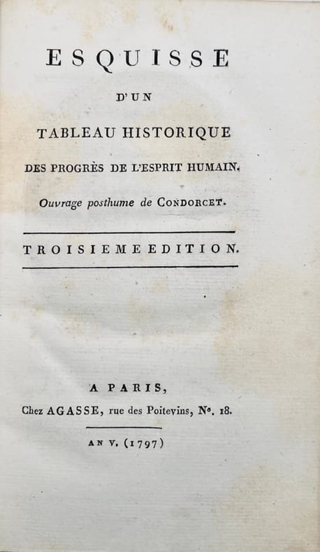 Edition originale. « L'Esquisse de Condorcet est la formulation la plus caractéristique de ce qu'on a pu appeler l'« idéologie du progrès ». On retrouve son influence dans les oeuvres de Saint-Simon et d'Auguste Comte. L'ouvrage a été publié pour la première fois en 1795. Les Conventionnels, qui deux ans auparavant avaient voté la mise en accusation puis la condamnation à mort de leur collègue, décidèrent alors, sur la proposition de Daunou, l'acquisition aux frais de l'État de 3000 exemplaires du livre du « philosophe infortuné ».Dos frotté, coins usés, petite galerie de ver marginale.PMM, 246 ; En français dans le texte, 196.