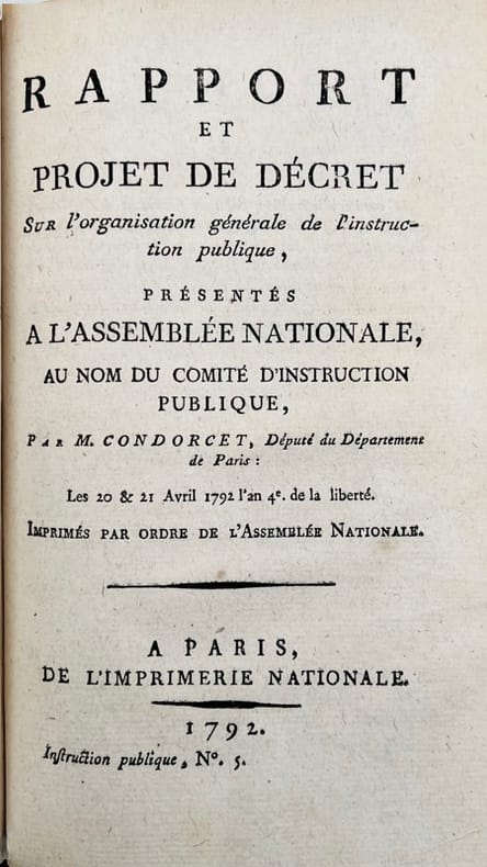 Paris, Agasse, 1797. In-8 de VIII-392 pp., portrait.CONDORCET (J.-A.-N. de Caritat, marquis de). Rapport et Projet de décret sur l'Organisation générale de l'Instruction publique, présenté à l'Assemblée nationale, au nom du comité d'Instruction Publique, les 20 et 21 avril 1792. Paris, Imprimerie Nationale, 1792. In-8 de (2)-94 pp.CONDORCET (J.-A.-N. de Caritat, marquis de). Apperçu des frais que coûtera le nouveau plan d'instruction publique, présenté au Comité d'instruction publique, par M. Condorcet le 24 mai 1792. De l’Imprimerie nationale, s.d. (1792). In-8 de 8 pp. 3 pièces reliées en 1 vol. in-8, maroquin rouge, dos lisse orné, pièce de titre en maroquin vert, frise dorée d’encadrement sur les plats (reliure de l’époque).