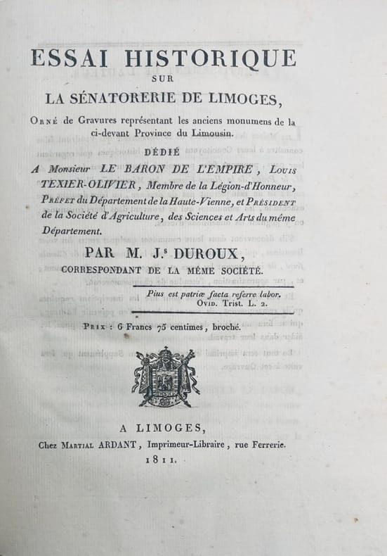 Limoges, Chapoulaud, 1821. In-4 de XII-372 pp.DUROUX (Jacques). Essai historique sur la Sénatorerie de Limoges. Limoges, Ardant, 1811. In-4 de (4)-V-(1)-297-(13) pp., 4 planches repliées hors-texte.Les deux pièces reliées en 1 vol. in-4, demi-veau taupe, dos orné à nerfs (Koehler).