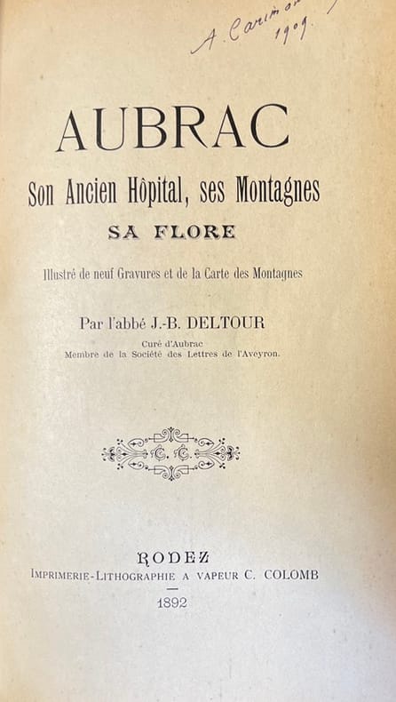 Rodez C. Colomb Rodez, C. Colomb, 1892. In-8 relié demi toile bleue, plats cartonnés. XVI + 306 pages. Bien complet de la carte dépliante des montagnes ou paturages du plateau d'Aubrac et de la vue générale de l'ancizen hôpital d'Aubrac. Quelques rousseurs pâles et bords des premières pages légèrement effrangés sans gravité. Reliure modeste. Bon exemplaire pour cette édition originale rare.