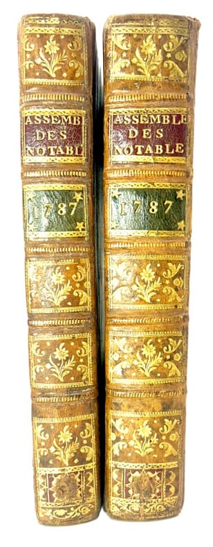 London, printed for J. Foxhunter, 1787. 20 works bound in 6 volumes. 8vo. Contemporary speckled calf, spines gilt in compartments, contrasting labels with gilt lettering, some scratches and some rubbing, two spines with some damage at head. I: Illustrative for the period preceding the Revolution and marking the ripening of public opinion for democratic ideas. V: Not in Kress; not in Goldsmiths; not in Einaudi; not in INED; not in Stourm. First edition. Exposé of the advantages of the physiocratic doctrine, published at the eve of the Assemblée de Notables. The 3rd part, which is nearly always lacking, is entitled: Projet raisonné d'un Bureau d'administration à l'usage des souverains. The publisher states that it forms 'une suite naturelle aux réflexions publiées sous les noms chers & respectés de Charles V, de Louis XII & de Henri IV. Il n'avoit point encore été publié par l'auteur (M. l'B***), des dépositaires infidèles s'étant approprié son manuscrit.' VI: Not in Kress; not in Goldsmiths. The first part was done by Mirabeau, Necker, Le Trosne and Saint-Péravy. The second part is entirely by N. Baudeau. VII: Reforms proposed concerning the properties and income of the clergy and the utilisation thereof. VIII: Edited by P.S. Dupont de Nemours who was secretary to the Assembly. 'The calling of the Assembly of Notables was a tacit recognition that the King could not govern against the will of the privileged ordres, but instead of gaining their support he found that by giving them an organ of self-expression he had merely opened the flood-gates of aristocratic revolt.' (Cobban, Aspects of the French Revolution). IX: The major part of these proposals for reforms were edited by P.S. Dupont de Nemours. X: First and second divisions of these critical notes reducing Calonne's projects to nothing of any value. XI: Concluding speeches by the King, Lamoignon, Loménie de Brienne, a.o. XII: Cf.: Kress B. 1281; not in Goldsmiths; INED 3185. The text is due to De Mirabeau in collaboration with Étienne Clavière, the later Girondin minister of Finance. XIII: Schelle 28; cf.: Kress B. 1203; INED 1614bis; Goldsmiths 13504. First edition. The 'Observations' are by J.P. Brissot de Warville. Edited by H.G. Mirabeau. Dupont made the text based on a draft by Turgot in 1776. XIV: Cf.: Kress B. 1292-5 (variant editions); not in Goldsmiths. In fact an edition of Mémoire publié au mois d'avril 1787 en réponse au discours prononcé par M. de Calonne devant l'Assemblée des Notables. XV: Cf.: Kress B. 1174-7 (other versions); Goldsmiths 13433-4 (other versions). XVI: Kress S. 5116; not in Goldsmiths. Fundamental criticism of Calonne. XVII: Kress B. 1182; not in Goldsmiths; INED 959. XVIII: Not in Kress; not in Goldsmiths; Stourm 137. Vehemently criticising Calonne. XIX: Kress B. 1375 (other edition); Goldsmiths 13616 (other edition). XX: Not in Kress; not in Goldsmiths. The supplement of 32 pp. has a caption title reading: Réédition de détails et d'éclaircissemens sur la conduite de M. de Calonne, à Versailles, à Rennes et à Saint-Malo, en 1765 et 1766; détails qui parurent en 1766 sous le titre d'addition au second mémoire de M. de La Chalotais.'The collection has been brought together at the time. The volumes are numbered 1, 1bis, 2-5 and a general title was printed reading: 'Recueil de pièces relatives aux événemens qui ont eu lieu en France en 1787, 1788, 17.. ' and short tables of contents in contemporary manuscript have been added.