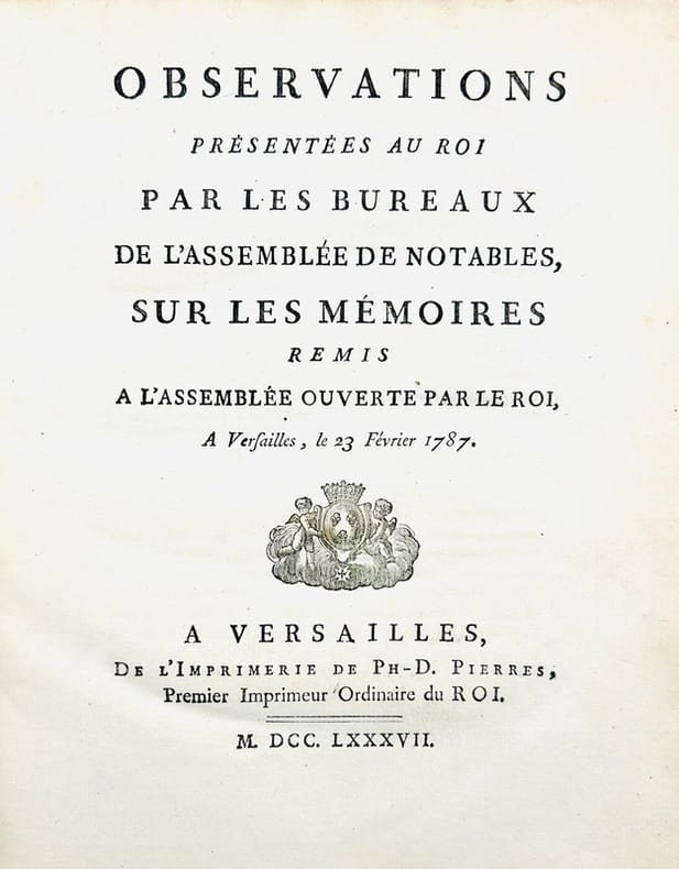 Série complète très rare en quatre "divisions" des Observations présentées au Roi par les Bureaux de l'Assemblée des Notables principalement rédigées par Dupont de Nemours secrétaire-greffier avec Pierre-Michel Hennin de l'Assemblée des Notables de 1787, en marge du procès-verbal et des mémoires présentés à l'Assemblée.Contient : 1e division. Assemblées provinciales, impôt territorial, dette du clergé, taille, commerce des grains, corvées ; 2e. Traites, marchandises coloniales, gabelles ; 3° Domaines du Roi, forêts domaniales ; 4° Examen de la situation des Finances, des économies ou améliorations nécessaires, des moyens d'empêcher le déficit de se reproduire et des projets particuliers concernant les impôts du timbre et de la subvention territoriale. Stourm : « Nous trouvons les procès-verbaux de ses séances conservés dans divers comptes rendus officiels (…) Les opinions exprimées par chaque membre y sont trop écourtées sans doute. Mais de plus amples développements accompagnent les résumés des diverses séries de délibérations et surtout les Observations destinées à être remises au Roi, rédigées par certains bureaux ». « Preuve du progrès des idées économiques, l'Assemblée se montra favorable à la suppression de la corvée et au rétablissement de la liberté du commerce des grains ; elle accepta l'impôt territorial à peu près tel que l'avait proposé Dupont de Nemours, c'est-à-dire avec la perception en argent ; elle réclama l'abolition totale de la gabelle, accueillit volontiers la suppression des droits de traite et se prononça pour l'établissement des assemblées provinciales » (Schelle, Dupont de Nemours , p. 266 sqq.). Bel exemplaire en grand papier. Petites traces de frottement un coin usé. Einaudi, 1974 ; Stourm, 135.