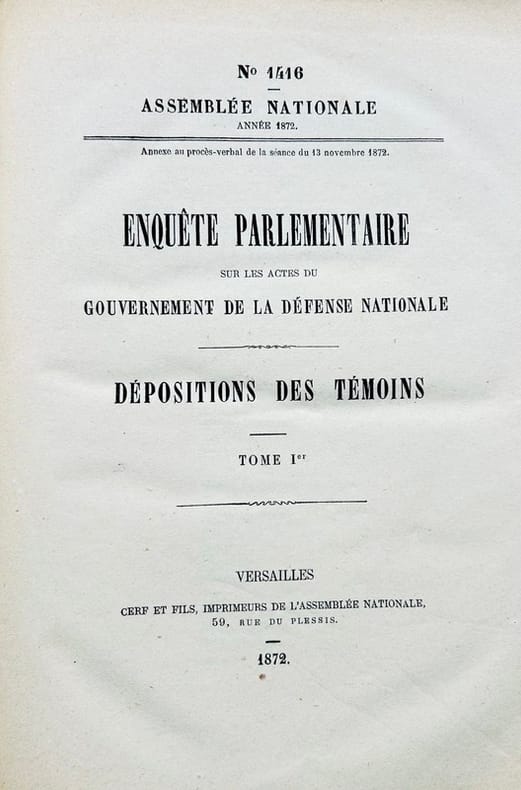 "1873. Versailles Cerf et fils Imprimeurs de l'Assemblée Nationale 1873 - Relié demi-bradel 21 cm x 27 5 cm 596 pages texte sur deux colonnes - Dépositions de M. de Freycinet Général Chanzy Général de Sonis Général Bourbaki Général Faidherbe ... - Tampons de la Librairie Taillebois de Dax et du relieur rousseurs sinon très bon état"