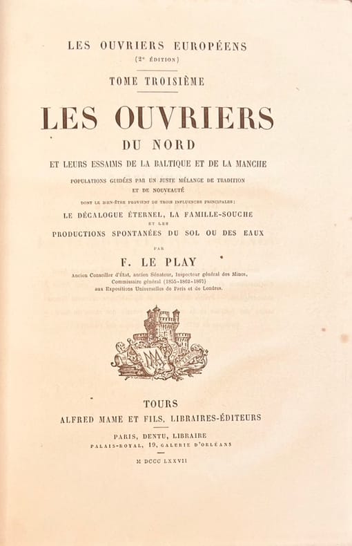 Deuxième édition largement augmentée. — Comment vivaient les travailleurs des deux sexes, et leur famille ? Comment étaient-ils logés ? Comment se nourrissaient-ils ? Comment étaient-ils habillés ? Quelles étaient leurs conditions de travail ? Quelles étaient leurs distractions et leurs aspirations ? Des réponses précises, irrécusables... Des enquêtes qui se lisent comme un roman. — Par Frédéric Le Play, sociologue nostalgique et inspiré, dont le concept de « famille-souche » et les méthodes d'enquêtes de « terrain » connaissent aujourd'hui dans les sciences sociales un succès posthume prodigieux. — "C’est en 1855, après un quart de siècle de travaux, que cédant aux conseils de François Arago, de Dumas et d’autres amis, Le Play commissaire général à la première exposition universelle française, se décida à publier ses premières monographie dans son grand ouvrage des Ouvriers européens. L’opinion publique n’étant pas encore prête à accepter ses conclusions, il réduisit son texte à un rapide commentaire de ses monographies et se borna à un court appendice, où il déclarait que « sa méthode lui avait fait retrouver, dans toute l’Europe, les éternelles traditions de l’humanité ». Encouragé par l’Académie des Sciences, qui lui décerna le prix Montyon de Statistique, il fonda, en 1856, la Société d’Économie sociale qui, s’inspirant de la méthode de son fondateur et restée fidèle à ses traditions, a puissamment contribué aux progrès de la science sociale et continue, dans une collection intitulée les Ouvriers des deux mondes, la publication des monographies de famille, d’après le cadre et le type consacrés par les Ouvriers européens." (Annales des Mines) — Tome I : La Méthode d’observation appliquée, de 1829 à 1879, à l’étude des familles ouvrières. – Tome II : Les Ouvriers de l’Orient et leurs essaims de la Méditerranée. Populations soumises à la tradition, dont le bien-être se conserve sous trois influences dominantes : le décalogue éternel, la famille patriarcale et les productions spontanées du sol. – Tome III : Les Ouvriers du Nord et leurs essaims de la Baltique et de la Manche. Population guidée par un juste mélange de tradition et de nouveauté, dont le bien-être vient de trois influences principales, le décalogue éternel, la famille-souche et les productions spontanées du sol ou des eaux. – Tome IV : Les Ouvriers de l’Occident. 1e série. Populations stables fidèles à la tradition devant les envahissements de la nouveauté, soumises au décalogue et à l’autorité paternelle, suppléant à la rareté croissantes des productions spontanées par la communauté, la propriété individuelle et le patronnage. – Tome V : Les Ouvriers de l’Occident. 2e série. Populations ébranlées envahies par la nouveauté, oublieuses de la tradition, peu fidèles au décalogue et à l’autorité paternelle, suppléant mal à la rareté croissante des productions spontanées par la communauté, la propriété individuelle et le patronnage. – Tome VI : Les Ouvriers de l’Occident. 3e série. Populations désorganisées égarées par la nouveauté, méprisant la tradition, révoltées contre le décalogue et l’autorité paternelle, empêchées par la désorganisation du travail et de la propriété de suppléer à la suppression des productions spontanées.