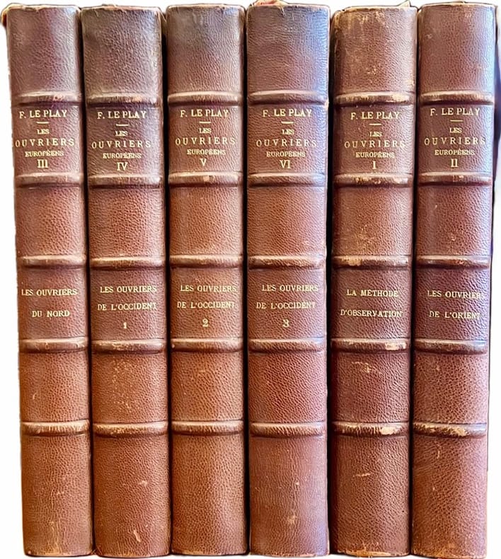 Deuxième édition largement augmentée. « C'est en 1855, après un quart de siècle de travaux, que cédant aux conseils de François Arago, de Dumas et d'autres amis, Le Play commissaire général à la première exposition universelle française, se décida à publier ses premières monographies dans son grand ouvrage des Ouvriers européens. L'opinion publique n'étant pas encore prête à accepter ses conclusions, il réduisit son texte à un rapide commentaire de ses monographies et se borna à un court appendice, où il déclarait que « sa méthode lui avait fait retrouver, dans toute l'Europe, les éternelles traditions de l'humanité ».Encouragé par l'Académie des Sciences, qui lui décerna le prix Montyon de Statistique, il fonda, en 1856, la Société d'Économie sociale qui, s'inspirant de la méthode de son fondateur et restée fidèle à ses traditions, a puissamment contribué aux progrès de la science sociale et continue, dans une collection intitulée les Ouvriers des deux mondes, la publication des monographies de famille, d'après le cadre et le type consacrés par les Ouvriers européens » (Annales des Mines).Tome I : La Méthode d'observation appliquée, de 1829 à 1879, à l'étude des familles ouvrières.Tome II : Les Ouvriers de l'Orient et leurs essaims de la Méditerranée. Populations soumises à la tradition, dont le bien-être se conserve sous trois influences dominantes : le décalogue éternel, la famille patriarcale et les productions spontanées du sol.Tome III : Les Ouvriers du Nord et leurs essaims de la Baltique et de la Manche. Population guidée par un juste mélange de tradition et de nouveauté, dont le bien-être vient de trois influences principales, le décalogue éternel, la famille-souche et les productions spontanées du sol ou des eaux.Tome IV : Les Ouvriers de l'Occident. 1° série. Populations stables fidèles à la tradition devant les envahissements de la nouveauté, soumises au décalogue et à l'autorité paternelle, suppléant à la rareté croissantes des productions spontanées par la communauté, la propriété individuelle et le patronnage.Tome V : Les Ouvriers de l'Occident. 2° série. Populations ébranlées envahies par la nouveauté, oublieuses de la tradition, peu fidèles au décalogue et à l'autorité paternelle, suppléant mal à la rareté croissante des productions spontanées par la communauté, la propriété individuelle et le patronnage.Tome VI : Les Ouvriers de l'Occident. 3° série. Populations désorganisées égarées par la nouveauté, méprisant la tradition, révoltées contre le décalogue et l'autorité paternelle, empêchées par la désorganisation du travail et de la propriété de suppléer à la suppression des productions spontanées.Exemplaire offert par l'École des Mines, prix Le Play, à M. Louis Hougas.Einaudi, 3329. Bon exemplaire, dos passés.