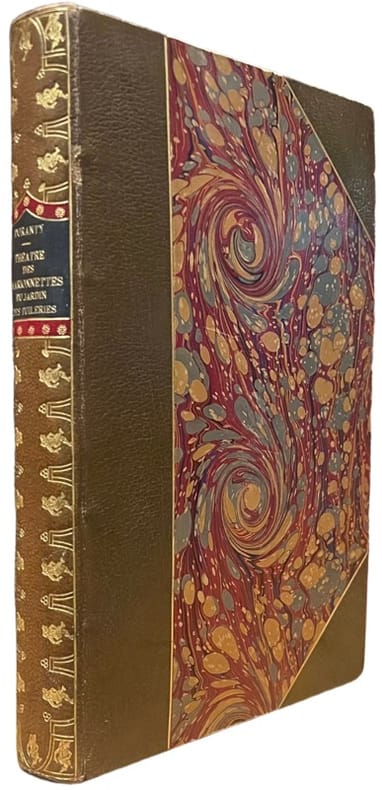 Édition originale illustrée par l'auteur Louis-Émile-Edmond Duranty (1833-1880) de 24 compositions hors-texte et 25 larges en-têtes, entièrement coloriés à l'aquarelle.Cofondateur de la revue Réalisme publiée de juillet 1856 à mai 1857 avec Champfleury, en compagnie duquel il défendra le mouvement réaliste et l'impressionnisme, le romancier et critique d'art Louis-Émile-Edmond Duranty (1833-1880) obtint en 1861 l'autorisation d'installer au jardin des Tuileries un théâtre de marionnettes fixe dont le peintre Gustave Courbet créa les décors. Duranty en composa le répertoire de vingt-quatre saynètes ayant pour héros Polichinelle, Pierrot et Arlequin.En 1870, les marionnettes de Duranty seront saisies par des créanciers, précipitant ainsi la fin du Guignol des Tuileries.Bel exemplaire à grandes marges dans une reliure à l'effigie de Polichinelle. Petites traces de frottement (coupes et coins).Vicaire : III, 534 ; Catalogue Lacombe, 3043.