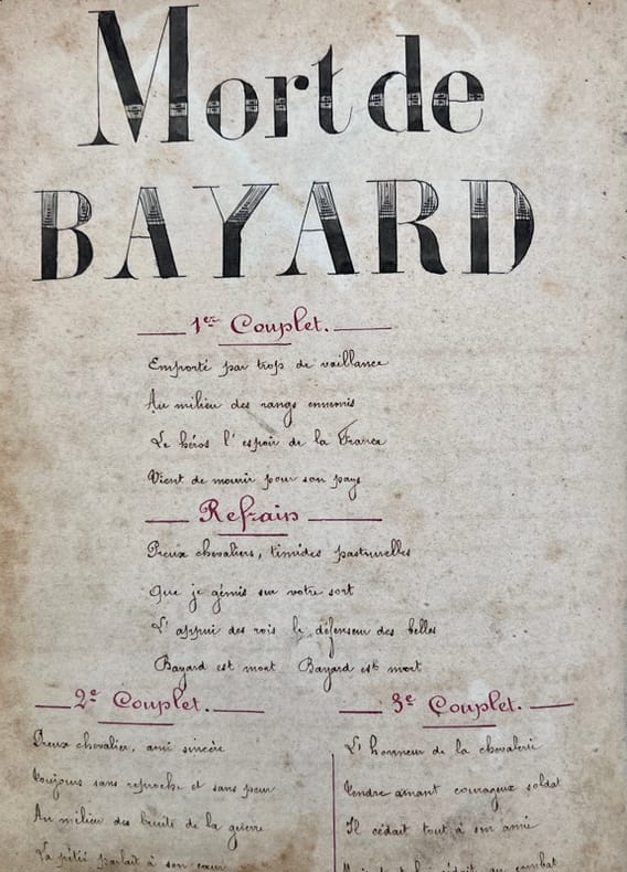 Chansonnier du sergent fourrier au 44e de ligne Achille Letienne établi après la guerre de 1870 (« Souvenir National 1870-1871 l'Alsace et la Lorraine », « Trahison de la guerre », « Champigny »), illustré de deux titres-frontispices sur carton et 163 titres calligraphiés et coloriés parfois augmentés d'une vignette historiée, d'une très grande variété de formes et de couleurs :Le Vagabond, Christoph Colomb, Mia Néra, Rappelle-toi, L'Écuyer, Les Cuirassiers, La Rencontre, Pédro, Le Roi s'amuse, Dans mon verre, Oh! Tais-toi, Le Voyageur, L'Aveugle, L'Hirondelle morte, Billets d'amour, Les Remors de Caïn, Le Chasseur et l'Hirondelle, Ce que j'aime, Tombé du nid, Les Sapins, Si j'avais ma mère, Le Fils de la Normandie, La Mort d'une mère, Qu'on se souvienne, Vous parlez d'avenir, Viens belle nuit, Gardez-vous de vieillir, L'Hiver, Un mot de toi, Binetôt, On ne meurt pas d'amour, Bastille, Ma cigarette, Petits coupeurs de bois, Le Bois de Vincennes, Le Roi des bohémiens, Le Grand Cambrinus etc. Ex-libris A.J.