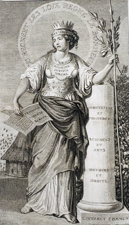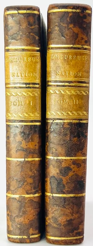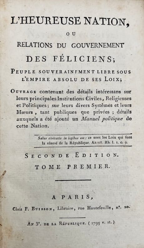 Édition originale avec titre de relais portant Seconde édition. Seule utopie physiocratique. Très rare.« Oeuvre de théorie sociale et politique non romanesque, en fait un Projet donné comme réalisé. Dans une Adresse à la Nation française, l'auteur explique qu'il entend indiquer les moyens d'assurer le bonheur de la nation. Il expose, dans un discours préliminaire, les principes philosophiques et sociaux d'une organisation politique : Les hommes doivent être gouvernés comme des hommes. Le gouvernement proposé est monarchique, mais en même temps soumis à la volonté générale. L'égalité et le droit de propriété y sont garantis, l'instruction publique et gratuite y est établie. Ce projet, qui maintient une noblesse héréditaire, justifiée par le mérite, et qui prône une restriction tout à fait symbolique de la proprité foncière, est révélateur de la volonté de compromis social de la grande bourgeoisie en 1792 » (Hartig).Frontispice gravé par Delauney d'après Marillier : Emblême du gouvernement Félicien. Très bon exemplaire.Hartig et Soboul, p. 77 ; Versins, 495a ; INED, 2790 ; Einaudi, 3304 ; Quérard V, 140.