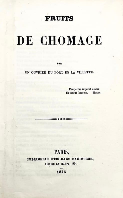 Recueil anonyme de poésies ouvrières imprimé à Paris en 1846 dont la Chanson des ouvriers du Port de la Villette, quand l’augmentation du prix du blé due à la mauvaise récolte de cette année-là accentuée par la crise économique et bancaire, provoqua la multiplication des faillites et la chute des cours de la Bourse. « Pour s’adapter à la crise de subsistance d’une sous-production agricole et régler les aspects nouveaux d’une surproduction industrielle, les grands travaux sont arrêtés et beaucoup d’employeurs renvoient les ouvriers. En 1848, près des deux tiers d’entre eux sont au chômage » (Révolution de février 1848 - Assemblée nationale).