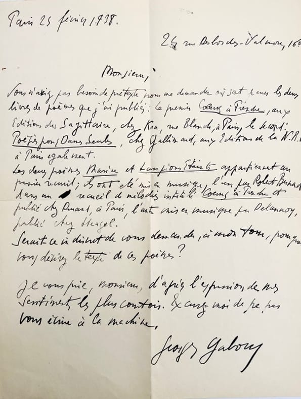 Édition originale ornée d'un portrait de l'auteur gravé sur cuivre par D. Galanis. Un des 1000 exemplaires numérotés sur vergé d'Arches (n°388).« Proches de l'École fantaisiste et pas trop éloignés des recherches d'une poésie nouvelle, comme Lingsor et Dyssord, nombre de créateurs affirment une transition et l'on pourrait les situer à l'aile gauche du Fantaisisme. Aisi Georges Gabory (1899-1978) fait partie de ces virtuoses à l'esprit léger parce que le coeur lourd qui ne cessent de masquer leur sentimentalité derrière des apprences bouffonnes. Il a des grâces acides et enrubannées qui le rapprochent de Max Jacob. Classiques dans la forme, il fait danser des vers gracieux qui nous parlent à mi-voix non sans quelque mièvrerie, mais avec un charme certain. Ses titres sont La Cassette de plomb, 1920, Coeurs à prendre, 1920, Poésies pour dames seules 1922 à la N.R.F. » (Robert Sabatier, La Poésie du XXe siècle. 1. Tradition et évolution, 1988).Provenance : Paul Éluard avec son ex-libris manuscrit sur le premier feuillet de garde daté "5-42". Joint : Lettre autographe signée Georges Gabory : Paris 25 février 1938, 24 rue Desbordes-Valmore, 16e. Monsieur, Vous n'avez pas besoin de prétexte pour me demander où sont parus les deux livres de poèmes que j'ai publiés : le premier Coeurs à prendre aux Éditions du Sagittaire chez Kra rue Blanche à Paris, le second Poésies pour Dames seules chez Gallimard aux éditions de la N.R.F. à Paris, également. Les deux poèmes Marine et Lampions éteints appartiennent au premier recueil ; ils ont été mis en musique, l'un par Robert Bernard dans un recueil de mélodies intitulé Coeurs à prendre et publié chez Renard à Paris, l'autre mis en musique par Delannoy publié chez Hengel. Serait-ce indiscret de vous demander à mon tour, pourquoi vous désirez le texte de ces poèmes ? Je vous prie Monsieur d'agréer l'expression de mes sentiments les plus courtois. Excusez-moi de ne pas vous écrire à la machine. Georges Gabory.