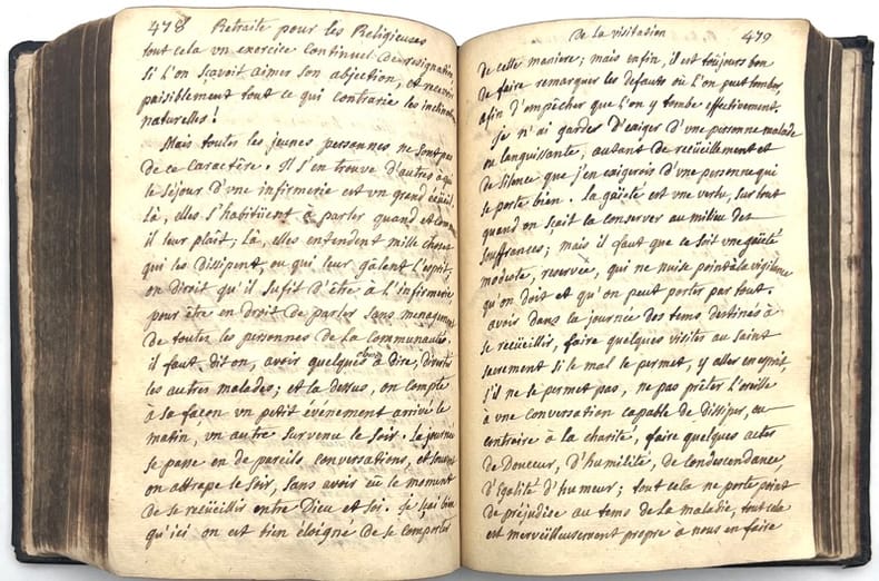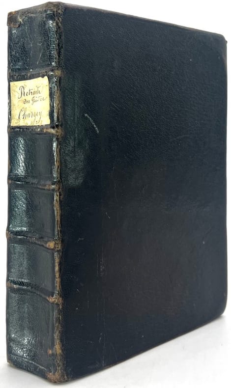 Manuscrit daté 1754 consacré à la retraite pour les religieuses de la Visitation Sainte-Marie de Bellecour à Lyon, établi selon l'avertissement d'après la parole du Révérend Père de Chargey : octave de méditations, conférences et lectures qui abordent plusieurs aspects de la vie religieuse comme les amitiés et les aversions naturelles, le voeu de chasteté, les péchés des religieux, la pensée de la mort, la médisance, les tentations secrètes, la vie domestique de Jésus Christ avec les apôtres etc. Suivi, avec une pagination séparée de : Récapitulation de la retraite donnée à l'Abbaye Royales des Dames de Saint Pierre de cette ville au mois de septembre 1754 par les Révérends Pères de Chargey et de Vaubonne qui contient Pratique de piété pour se préparer à la fête de Saint François de Sales, les trois jours qui la précèdent et pour l'octave qui la suit.L’ordre de la Visitation Sainte-Marie est présent à Lyon à partir de 1615. Le premier monastère est ouvert à Bellecour : la Visitation Sainte-Marie de Bellecour. En 1613, les travaux du premier monastère de l’ordre débutent à Annecy et se termineront en 1614. Face au succès rencontré, l’ordre décide très vite de fonder d’autres couvents. Lyon est choisi pour la création d’un deuxième établissement en 1615. Ce sera le premier en France. Mais pour obtenir les autorisations, François de Sales va se confronter au cardinal archevêque de Lyon Denis-Simon de Marquemont qui refusera de transiger sur ce qui constituait jusqu’alors les fondements mêmes de l’ordre : une clôture stricte devra être respectée par les sœurs et ce afin de se conformer aux règles en vigueur imposées par Rome aux congrégations de religieuses. A partir de cette date, cette règle s’appliquera à tous les nouveaux monastères de l’ordre qui s’ouvriront et se traduira physiquement dans les plans des monastères qui seront conçus de façon à respecter la réclusion des soeurs. (Patrimoine Lyon)Provenance manuscrite (titre) : « Ce livre du Monastère de la Visitation de Ste Marie de Montélimar ».Un seul manuscrit attribué au Père de Chargey est recensé au Catalogue collectif de France et conservé à la Bibliothèque de l’Académie des Sciences, Belles-Lettres et Arts de Lyon (cote Ms PA 86) : « Retraite spirituelle, donnée dans le premier monastère de la Visitation Sainte-Marie de Bellecour, à Lion, en 1754, par le R. P. de Chargey, de la C. de J. » (279 pages).Copieux manuscrit rédigé à l'encre brune, parfaitement lisible, conservé dans sa première reliure en maroquin noir janséniste.