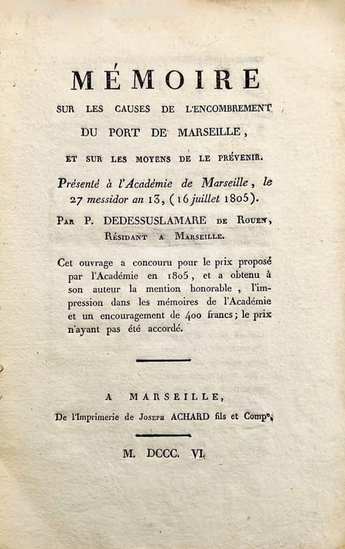 Édition originale illustrée d'une planche repliée : construction d'un réservoir (plan de coupe). « (…) l'encombrement du port de Marseille est dû en très grande partie : 1. à la malpropreté des places, rues et carrefours de cette ville 2. à l'insouciance de quelques particuliers qui ne se dirigent que par l'égoïsme, ce vil destructeur des liens sociaux 3. enfin à diverses autres causes dont le dénombrement aura lieu successivement ».