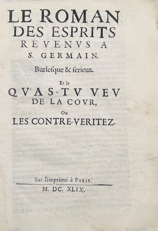 Un de ces jours passés, que le ciel était beau et serein, le plaisir de la promenade, et le désur de revoir la Cour m'attirèrent insensiblement jusques à Saint Germain (incipit). Moreau, Mazarinades, 3559 : « Même pièce que l'Histoire des esprits etc. »