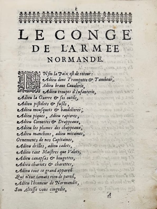 Pamphlet en vers attribué par Édouard Frère à l'imprimeur-libraire et poète de Rouen David Ferrand (1589-1660) publié la même année sous le titre augmenté « Le Congé burlesque de l'armée normande ». Moreau : «Il existe de cette pièce une édition sans lieu ni date de 4 pages. L'épithète de Burlesque ne se trouve pas au titre. Est-ce l'édition originale ? ».Moreau, Mazarinades, 752 ; Frère, I, 463.