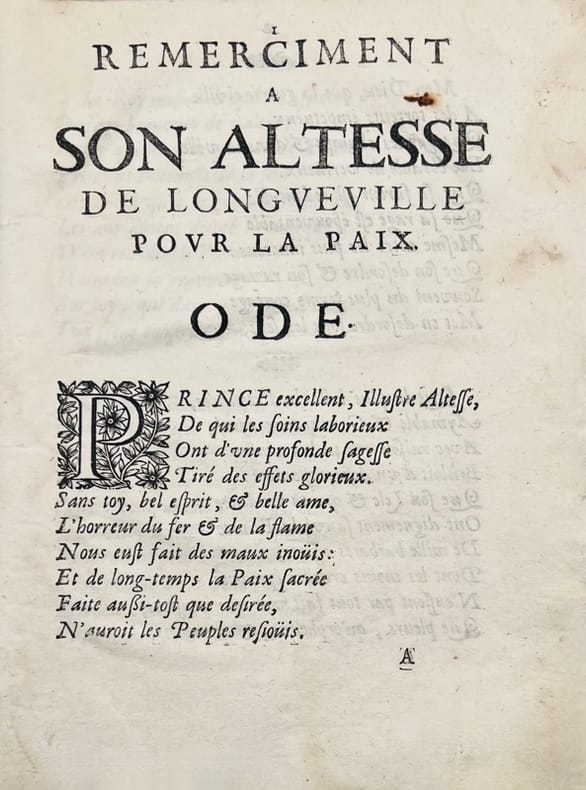 Édition originale. Le 10 janvier 1649 arrivent à Paris le prince de Conti et le duc de Longueville, frère et beau-frère du Grand Condé, qui rejoignent le camp du Parlement. De la Fronde parlementaire à la Fronde des Princes : le 11 mars 1649, à Rueil, à l'ouest de Paris, la régente Anne d'Autriche et son Premier ministre Jules Mazarin concluent la paix avec le président du Parlement de Paris, Mathieu Molé. C'est la fin de la Fronde parlementaire. Moreau, Mazarinades, 3271.