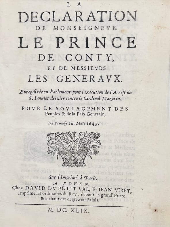 Édition rouennaise établie sur l'imprimé à Paris. Dans la nuit du 5 au 6 janvier 1649, la Reine mère, le jeune Roi, les princes et le cardinal quittent Paris pour se réfugier à Saint-Germain-en-Laye. Le départ de la famille royale crée dans Paris une situation insurrectionnelle. Le Parlement se trouve à la tête du mouvement et l’arrivée des troupes rappelées des frontières par Mazarin le contraint à rechercher des appuis. Les princes et les grands seigneurs se proposent, poussés par le désir de rétablir leur puissance affaiblie très sensiblement par Richelieu sous le règne de Louis XIII. Le 11 janvier 1649, le prince de Conti, est déclaré « généralissime des armées du roi, sous les ordres et l’autorité du Parlement ». Pendant deux mois Condé assiège Paris, avec 8 000 hommes. Mais les Frondeurs sont trop divisés pour triompher. Des pourparlers sont engagés entre tous les partis et le 11 mars 1649 la paix de Rueil accorde un pardon général. La cour se réinstalle à Paris. Moreau, Mazarinades, 886.