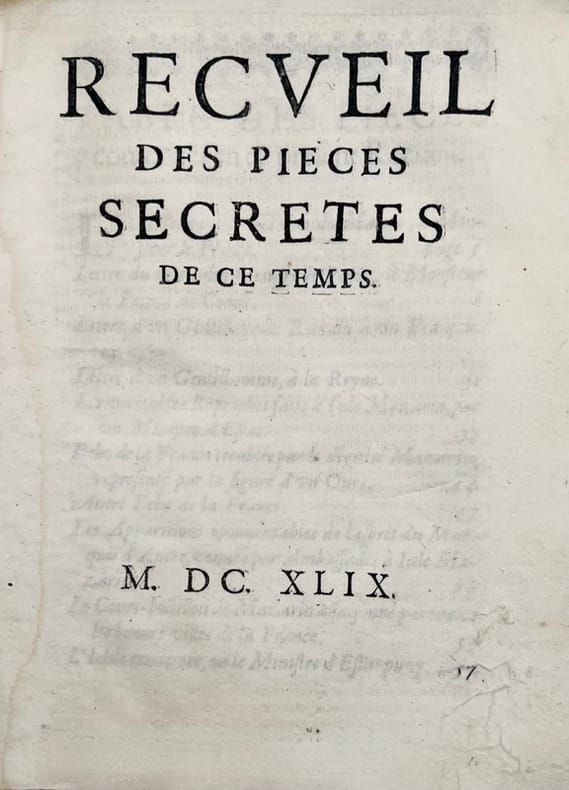 Collection complète sous ce titre de vingt-et-une mazarinades. Manque 2 feuillets au second recueil (cahier G, pages 25 à 28), petit trou au feuillet de titre sans perte de lettres. Moreau, Mazarinades, 3053.